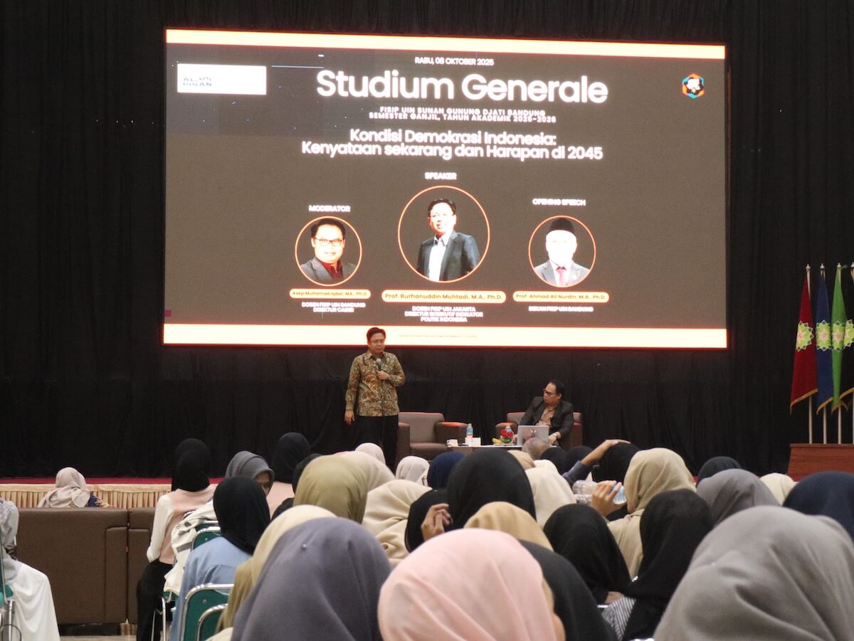 Fakultas Ilmu Sosial dan Ilmu Politik (FISIP) UIN Sunan Gunung Djati Bandung melalui Centre for Asian Social Science Research (CASSR) menggelar Studium Generale Semester Ganjil Tahun Akademik 2025-2026 dengan tema “Kondisi Demokrasi Indonesia: Kenyataan Sekarang dan Harapan di 2045” di Aula Anwar Musaddad, Rabu, 8 Oktober 2025.