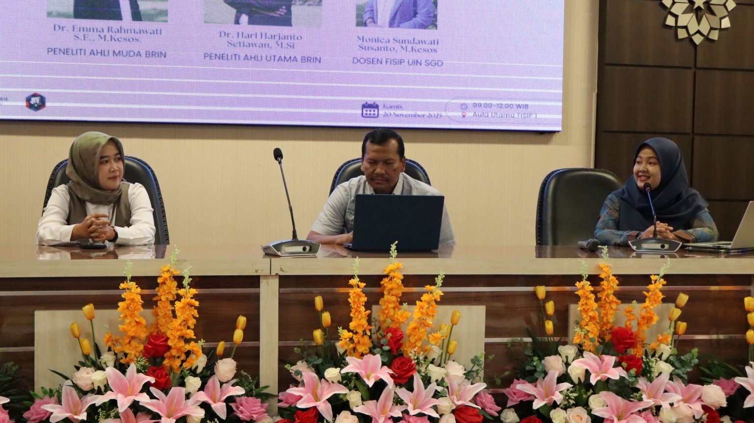 Bandung, 20 November 2025 — Fakultas Ilmu Sosial dan Ilmu Politik (FISIP) UIN Sunan Gunung Djati Bandung kembali menyelenggarakan Forum Dosen FISIP (FDF) edisi ke-33 dengan mengangkat tema “Pemberdayaan Masyarakat Desa yang Berkelanjutan.” Acara ini digelar di Aula Utama FISIP dan menghadirkan dua peneliti dari Badan Riset dan Inovasi Nasional (BRIN), yaitu Dr. Hari Harjanto Setiawan dan Dr. Emma Rahmawati. Forum dipandu oleh Monica Sundawati Susanto, M.Kesos., dan dihadiri dosen serta mahasiswa yang antusias mengikuti jalannya diskusi.